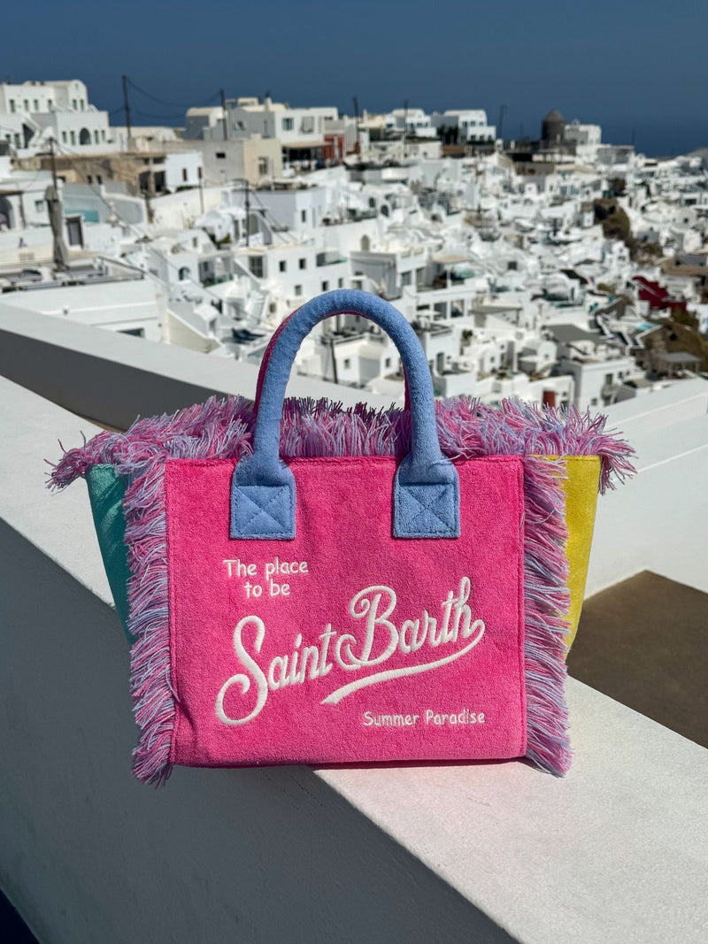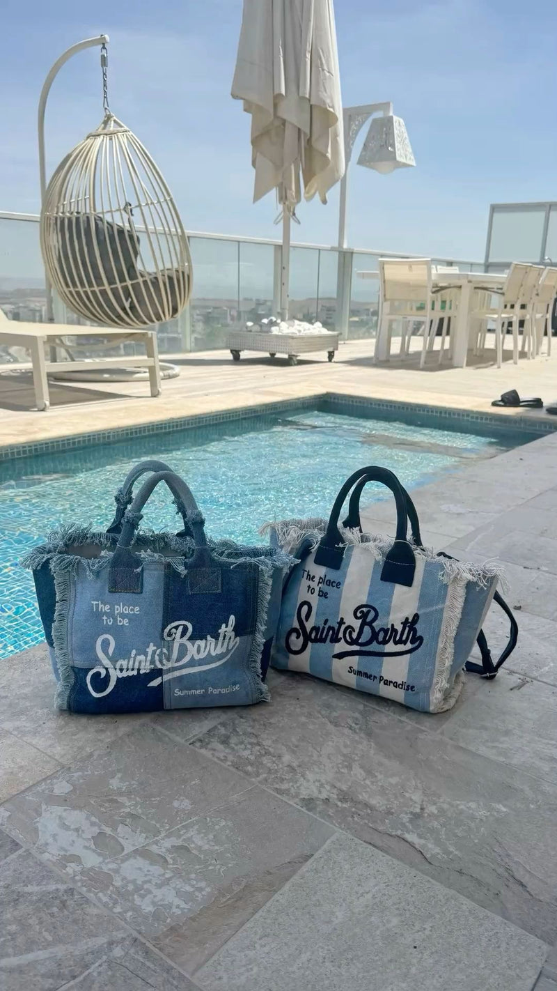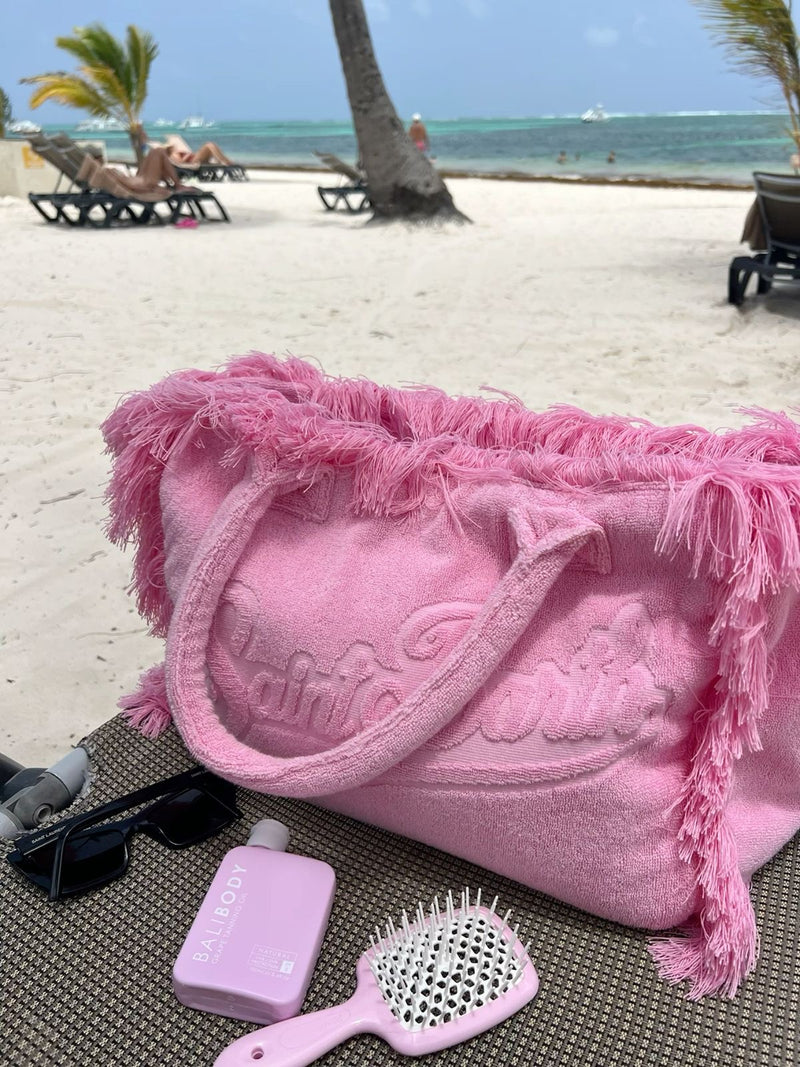 Design iconico con frange, logo ricamato e manici rinforzati. Capiente abbastanza per telo, crema, ciabatte, libro, occhiali e tutto quello che serve per una giornata perfetta in spiaggia. Chiusura zip in alto e tasca interna per telefono e chiavi.